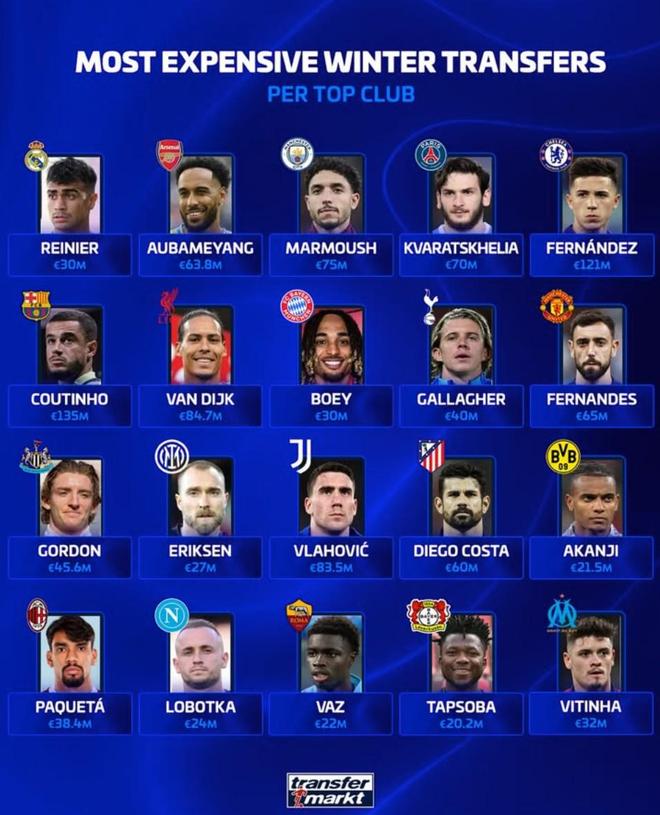 北京时间1月19日,德转列出了欧洲五大联赛20大俱乐部各自队史的冬窗最贵引援,巴塞罗那1.35亿欧元引进库蒂尼奥高居第一,切尔西1.21亿欧元引进恩佐-费尔南德斯第二,利物浦8470万欧元引进范戴克第三。
